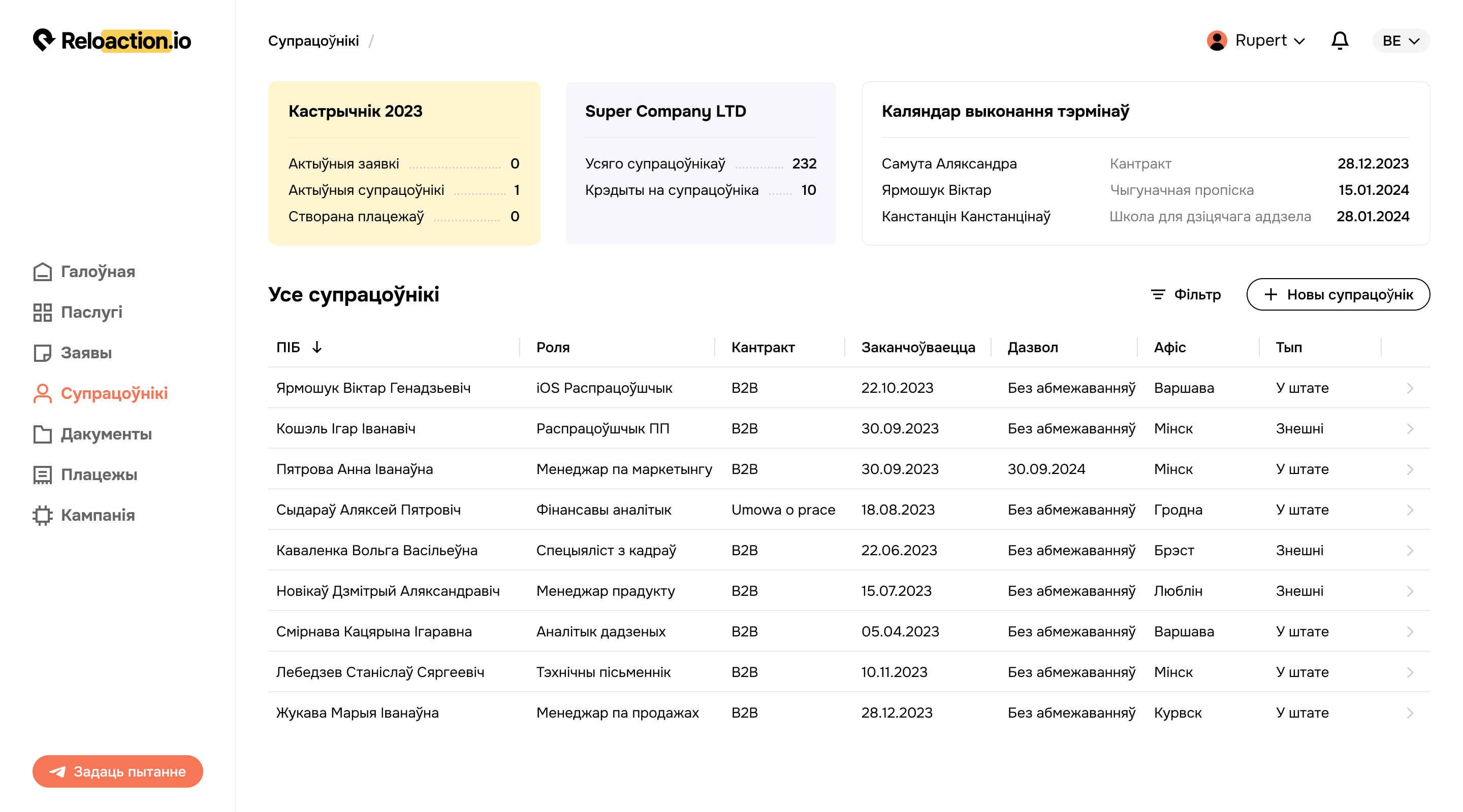 Забраніраваць дэмаПлатформа забяспечвае зручнасць як для супрацоўнікаў, так і для HR-спецыялістаў, збіраючы ўсе інструменты ў адным месцы і палягчаючы абмен дакументамі паміж калегамі. HR могуць кантраляваць дазволы на жыхарства супрацоўнікаў і атрымліваць апавяшчэнні аб заканчэнні тэрміну іх дзеяння